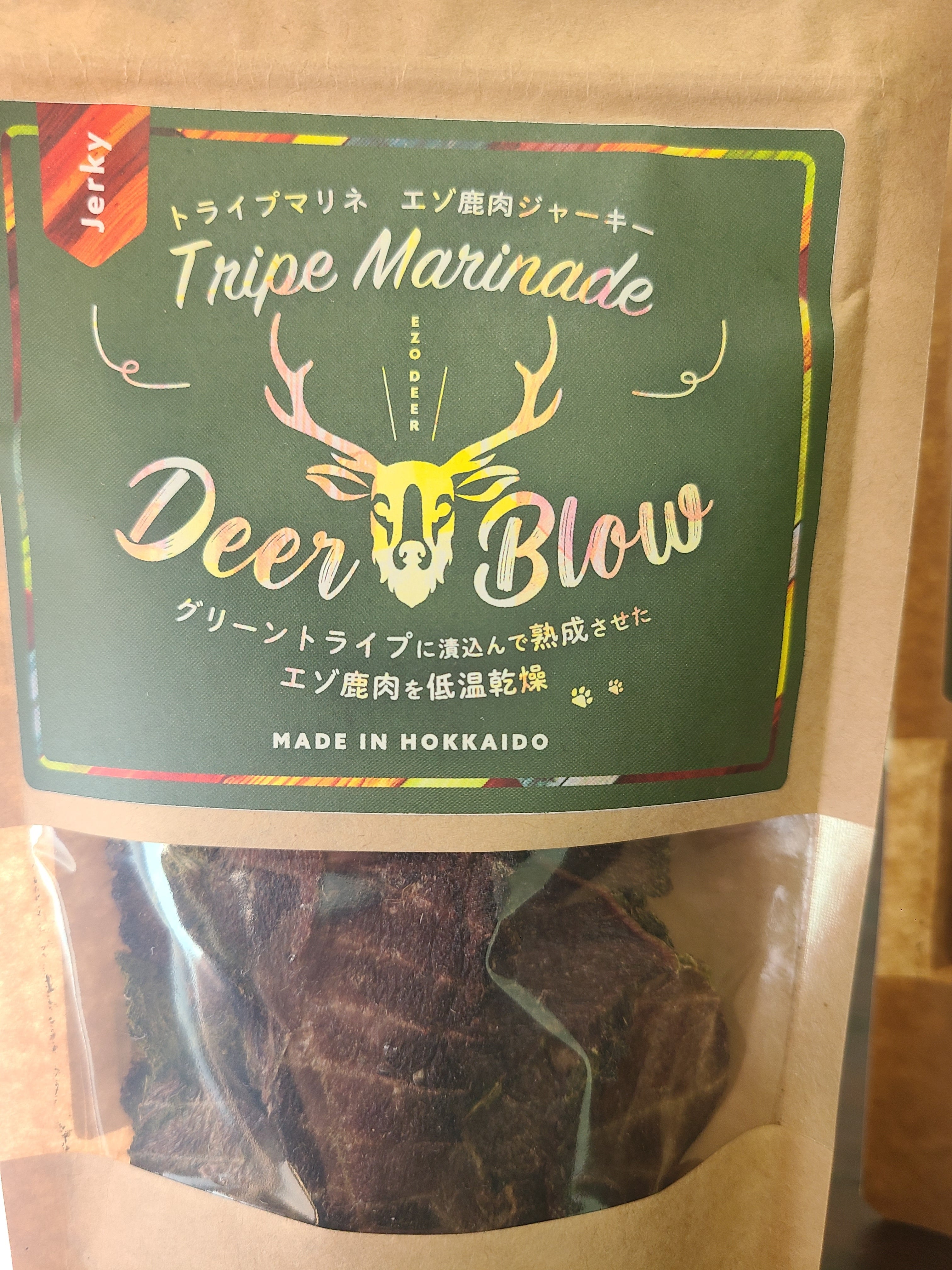 北海道産エゾ鹿肉をトライプに漬け込み熟成させた嗜好性抜群のジャーキー。※天然エゾ鹿のトライプ(胃内容物)を使用しているため、収穫時期により匂いや色が変化する場合がございます